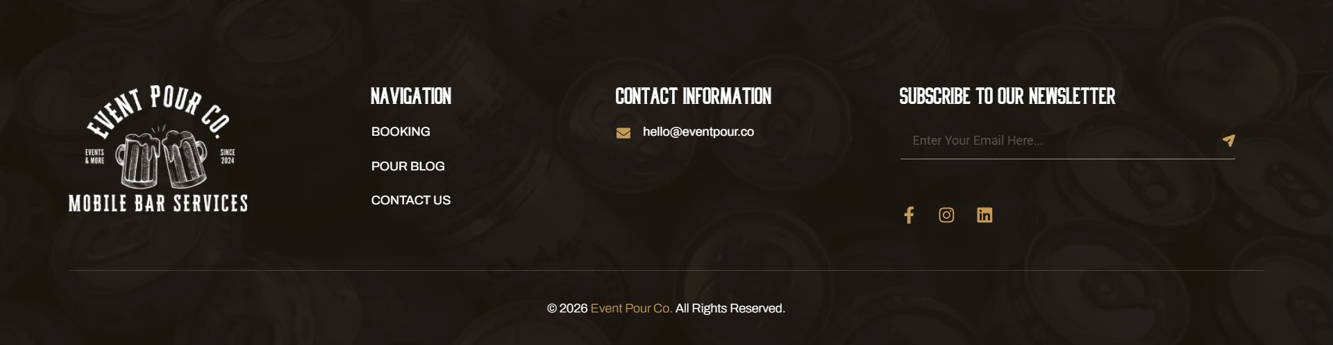Event Pour Co. is a mobile bar service focused on bringing a premium, seamless experience to events of all sizes. The goal for this project was to reflect that same level of experience online — something that feels polished, easy to navigate, and clearly communicates what they offer without overcomplicating it.